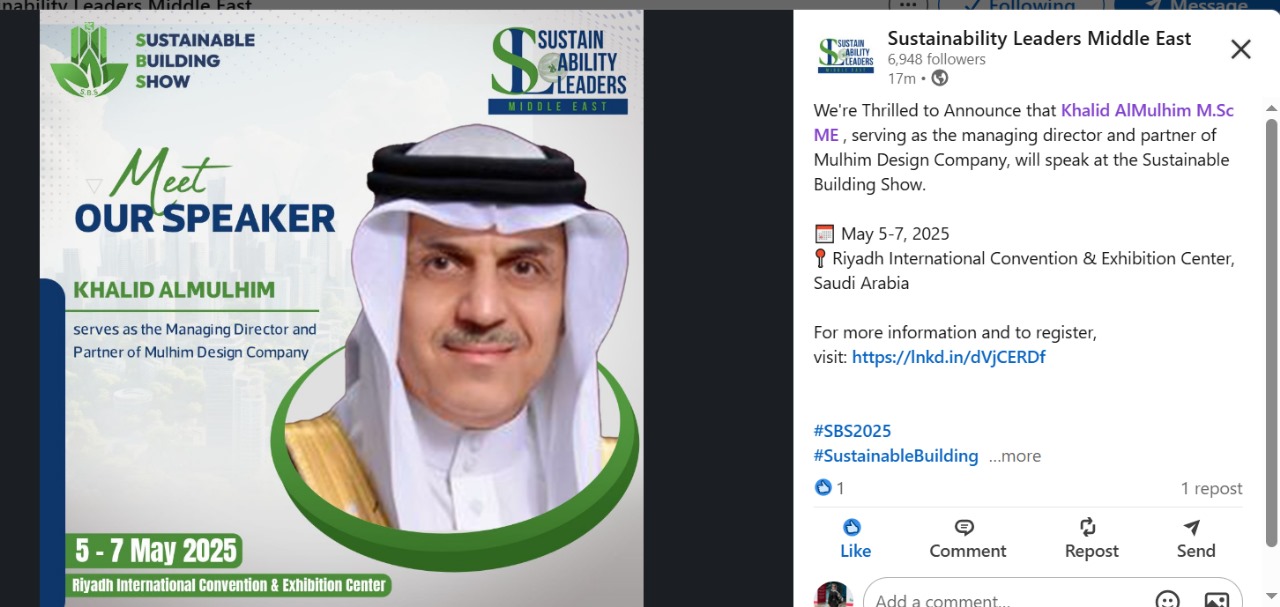 We are proud to share that our Managing Director, Khalid AlMulhim, was honored as a keynote speaker at the Saudi Sustainable Building Show 2025, held at the Riyadh International Convention & Exhibition Center from May 5–7, 2025.
